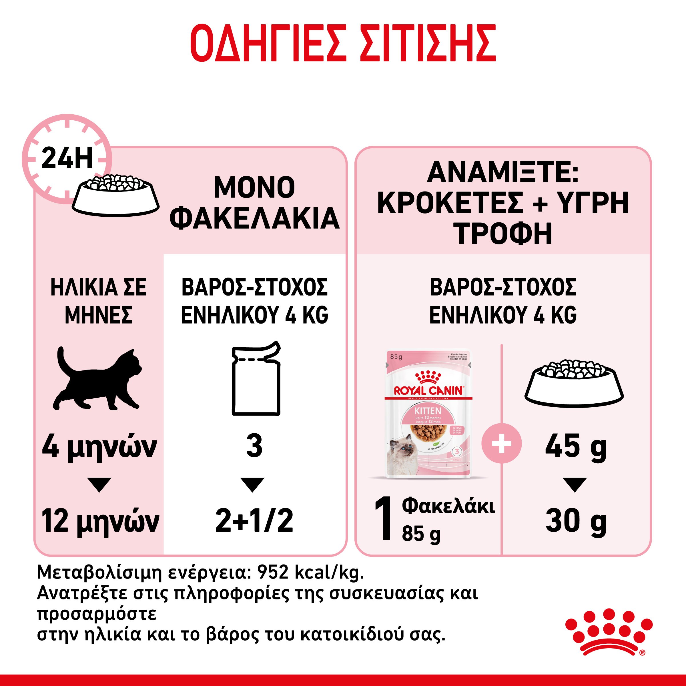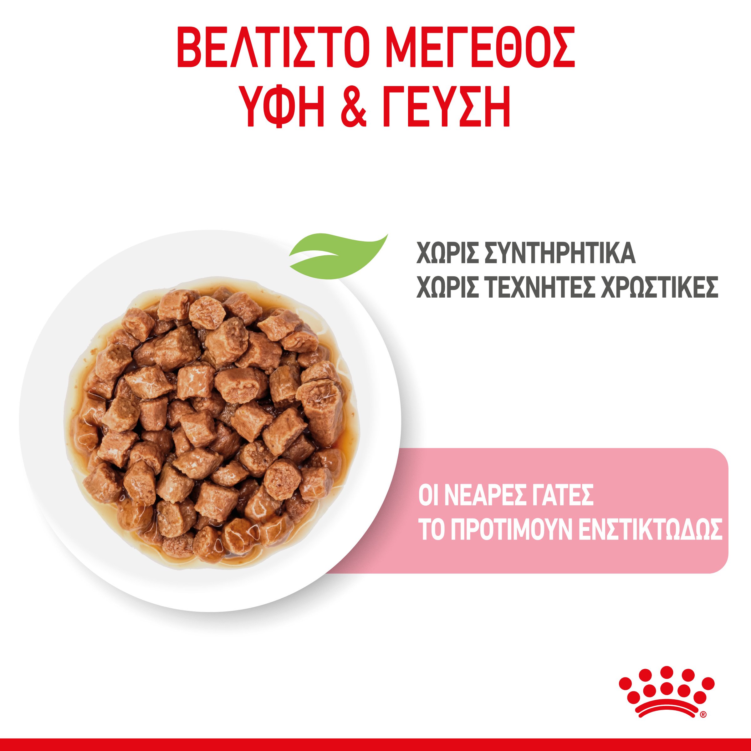 Πλήρης υγρή τροφή με κομμάτια κρέας σε σάλτσα ιδανική για νεαρές γάτες ηλικίας 4 έως 12 μηνών. Σε αυτή την κρίσιμη περίοδο της ζωής τους, οι γάτες περνούν από σημαντικές σωματικές και συμπεριφορικές αλλαγές και αυτή η φόρμουλα προσφέρει τα θρεπτικά συστατικά που χρειάζονται για να υποστηρίξουν την ανάπτυξή τους. Η τροφή έχει μια απαλή υφή υγρού πατέ, η οποία προσφέρει την τέλεια γευστικότητα και είναι εύκολη στην κατανάλωση από τις νεαρές γάτες.