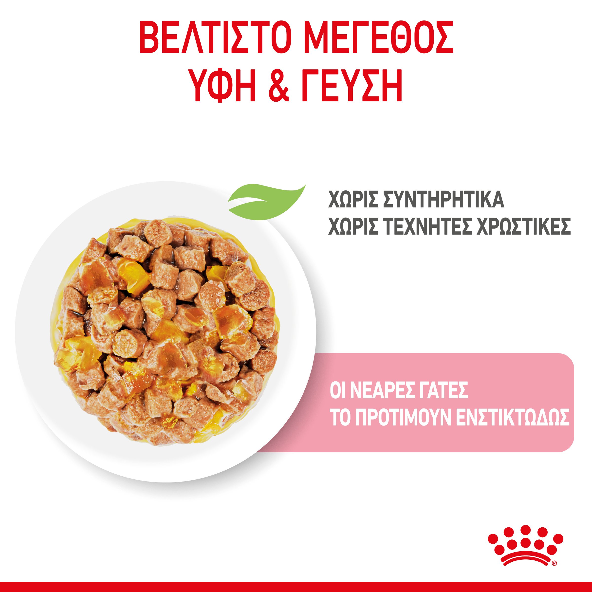 Πλήρης υγρή τροφή με κομμάτια κρέας σε ζελέ ιδανική για νεαρές γάτες ηλικίας 4 έως 12 μηνών. Σε αυτή την κρίσιμη περίοδο της ζωής τους, οι γάτες περνούν από σημαντικές σωματικές και συμπεριφορικές αλλαγές και αυτή η φόρμουλα προσφέρει τα θρεπτικά συστατικά που χρειάζονται για να υποστηρίξουν την ανάπτυξή τους. Η τροφή έχει μια απαλή υφή υγρού πατέ, η οποία προσφέρει την τέλεια γευστικότητα και είναι εύκολη στην κατανάλωση από τις νεαρές γάτες.