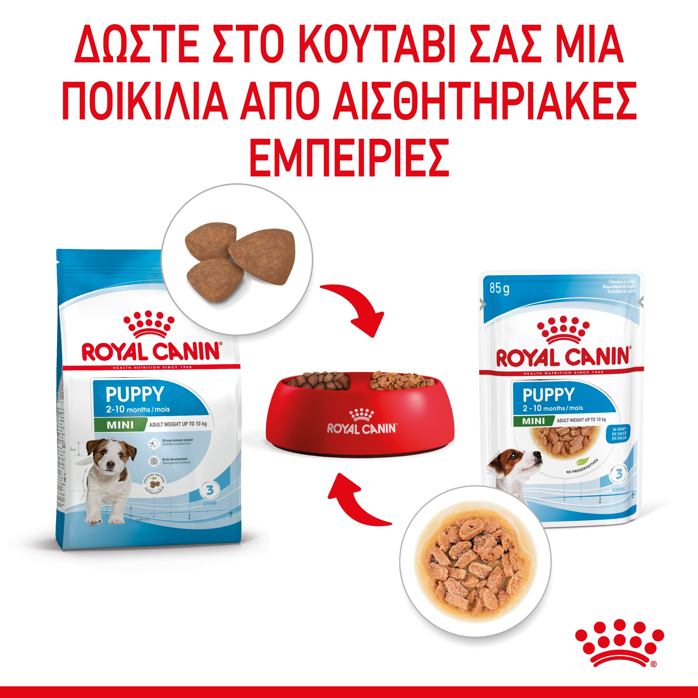 Πλήρης υγρή τροφή με κομματάκια κρέας σε σάλτσα για ανήλικους σκύλους μικρόσωμων φυλών έως 10 μηνών, με αναμενόμενο ενήλικο βάρος έως 10kg. Συμβάλλει στην υγιή ανάπτυξη και στη δημιουργία ενός γερού ανοσοποιητικού συστήματος, αφού η περιεκτικότητά της σε ένα σύμπλεγμα αντιοξειδωτικών, όπως η βιταμίνη Ε, βοηθά στην υποστήριξη των φυσικών αμυνών του κουταβιού σας. Επιπλέον, υποστηρίζει την πεπτική υγεία και την ισορροπία της εντερικής χλωρίδας, ενώ τέλος η ενισχυμένη περιεκτικότητά της σε ενέργεια καλύπτει τις ανάγκες των κουταβιών των μικρόσωμων φυλών.