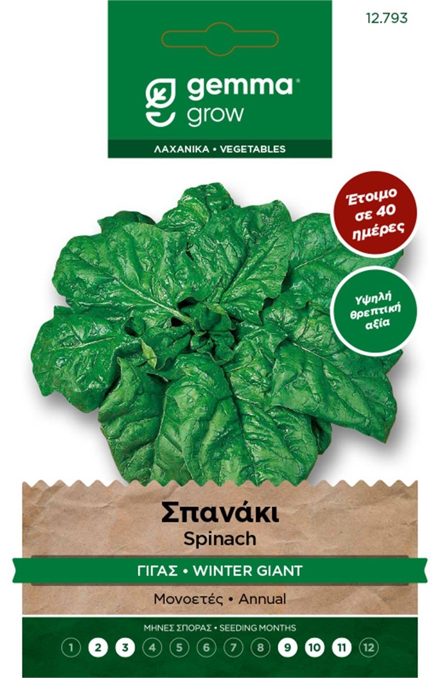 Υψηλή θρεπτική αξία. Έτοιμο σε 40 ημέρες. Μονοετές. Ποικιλία με μεγάλο φύλλωμα λείο, χρώματος πράσινου και σχήματος οβάλ, κατάλληλο για φθινοπωρινή σπορά. Απόσταση φυτών (εκ.): 5-10. Απόσταση γραμμών (εκ.): 20-30. Βάθος σποράς (εκ.):2. Ημέρες φυτρώματος: 10-15. Έναρξη συγκομιδής (ημέρες): 40. Ποικιλία: Gigante de invierno. 5911