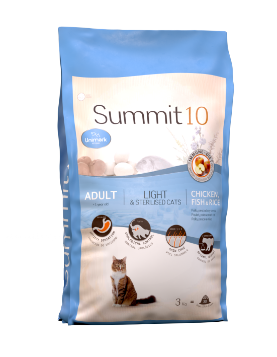 Η Summit 10 Adult Light & Sterilised Cats είναι μια πλήρης και ισορροπημένη ξηρά τροφή, ειδικά σχεδιασμένη για ενήλικες γάτες (άνω του 1 έτους) που είναι στειρωμένες ή/και τείνουν προς την αύξηση βάρους (Light). Η φόρμουλα αυτή βοηθά στη διατήρηση ενός υγιούς σωματικού βάρους, ενώ ταυτόχρονα υποστηρίζει το ουροποιητικό σύστημα, μια συχνή ανάγκη στις στειρωμένες γάτες.