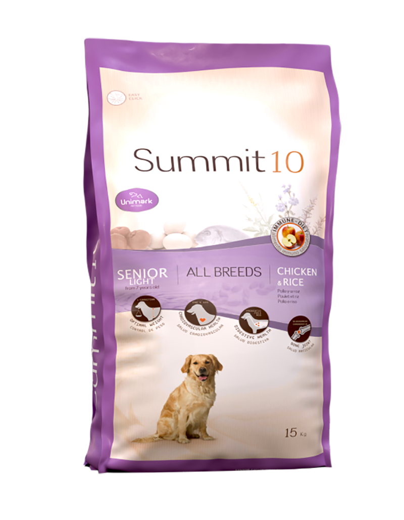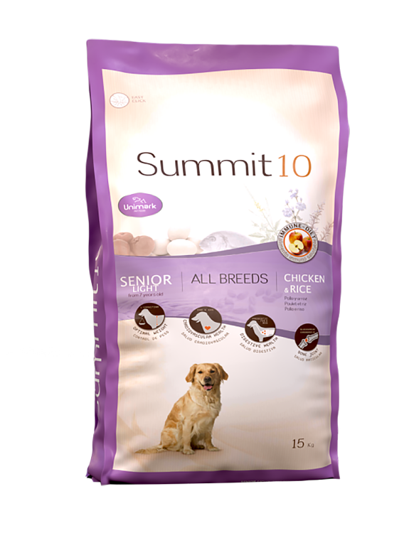 Η Summit 10 Dog Light & Senior σε συσκευασία 15kg είναι μια πλήρης, ισορροπημένη ξηρά τροφή κατηγορίας Super Premium, ειδικά μελετημένη για να καλύπτει τις ανάγκες δύο ευαίσθητων ομάδων: των ηλικιωμένων σκύλων (άνω των 7 ετών) και των ενήλικων σκύλων με τάση για παχυσαρκία.