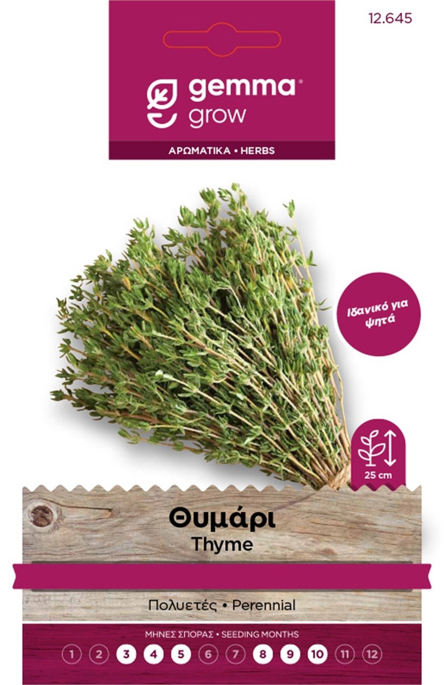 Ιδανικό για ψητά. Πολυετές. Φύλλα πολύ αρωματικά που χρησιμοποιούνται στη μαγειρική. Απόσταση φυτών (εκ.): 20. Απόσταση γραμμών (εκ.): 30. Βάθος σποράς (εκ.):0,5. Ημέρες φυτρώματος: 15-20. Έναρξη συγκομιδής (ημέρες): 60. Thymus vulgaris. 0275
