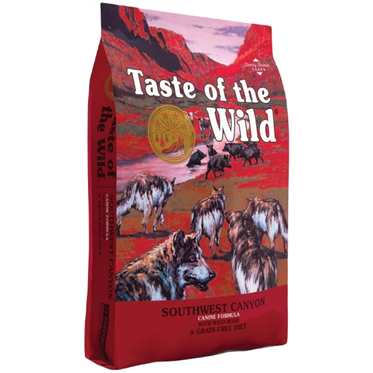 Η ξηρά τροφή σκύλων Taste of the Wild Southwest Canyon Canine grain free παρασκευάζεται στις Η.Π.Α. από υψηλής ποιότητας κρέας από βοδινό, αρνί, αγριογούρουνο και ψάρι.