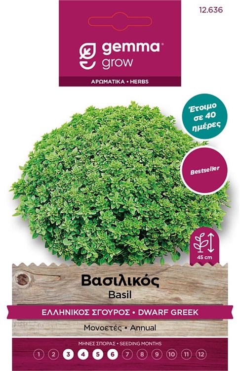 Bestseller. Έτοιμο σε 40 ημέρες. Μονοετές. Ποικιλία κλασική ελληνική, με μικρά φύλλα, ιδιαίτερα αρωματικά. Με τακτική κορυφολόγηση μεγαλώνουμε τον όγκο του φυτού. Σε ελαφριά στραγγιζόμενα εδάφη συστήνεται καλό πότισμα. Απόσταση φυτών (εκ.): 30. Απόσταση γραμμών (εκ.): 50. Βάθος σποράς (εκ.):0,1. Ημέρες φυτρώματος: 10-12. Έναρξη συγκομιδής (ημέρες): 40. Ocimum basilicum. 0385