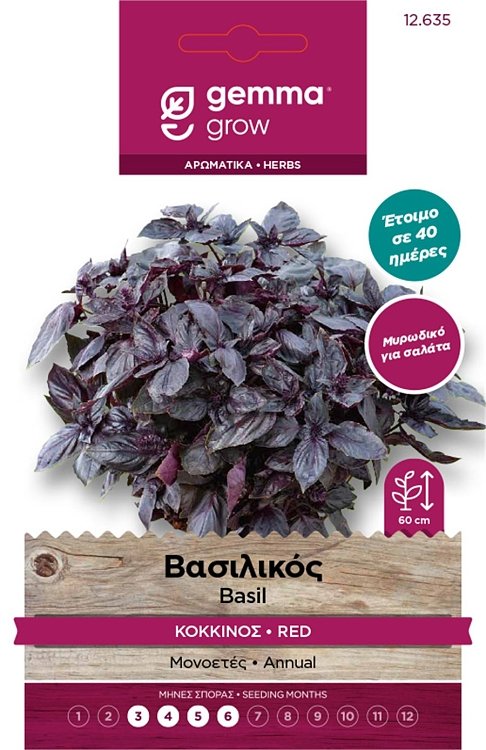 Μυρωδικό για σαλάτα. Έτοιμο σε 40 ημέρες. Μονοετές. Φύλλα χρώματος κόκκινου σκούρου, ελαφρώς πομφολυγώδη, έντονα αρωματικό. Με τακτική κορυφολόγηση μεγαλώνουμε τον όγκο του φυτού. Σε ελαφριά στραγγιζόμενα εδάφη συστήνεται καλό πότισμα. Απόσταση φυτών (εκ.): 30. Απόσταση γραμμών (εκ.): 30. Βάθος σποράς (εκ.):0,1. Ημέρες φυτρώματος: 10-12. Έναρξη συγκομιδής (ημέρες): 40. Ocimum basilicum. 0035