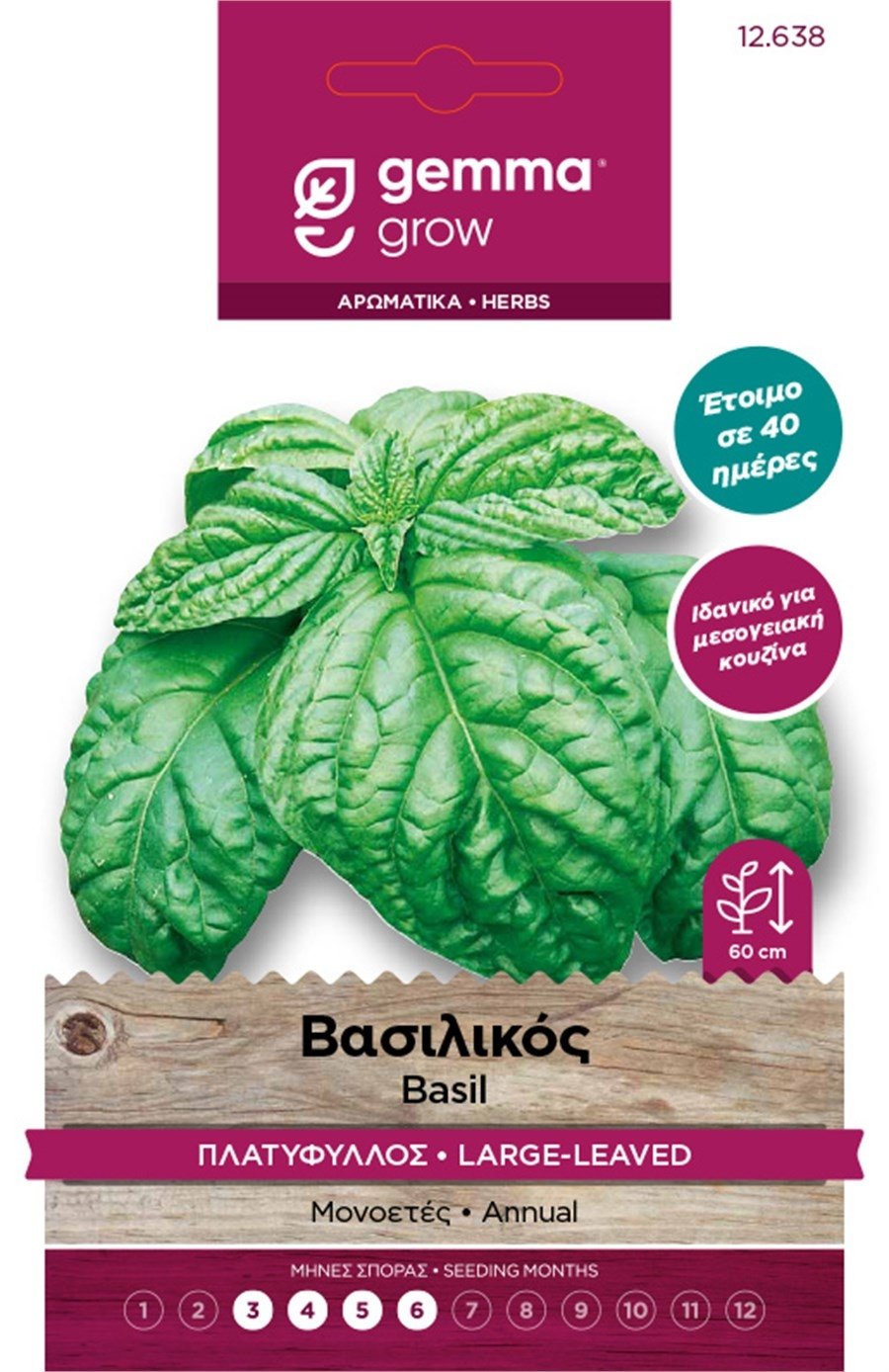 Ιδανικό για μεσογειακή κουζίνα. Έτοιμο σε 40 ημέρες. Μονοετές. Ποικιλία με μεγάλα φύλλα, πομφολυγώδη, χρώματος πράσινου, μέτριας αρωματικότητας. Με τακτική κορυφολόγηση μεγαλώνουμε τον όγκο του φυτού. Σε ελαφριά στραγγιζόμενα εδάφη συστήνεται καλό πότισμα. Απόσταση φυτών (εκ.): 30. Απόσταση γραμμών (εκ.): 50. Βάθος σποράς (εκ.):0,1. Ημέρες φυτρώματος: 10-12. Έναρξη συγκομιδής (ημέρες): 40. Ocimum basilicum. 0281
