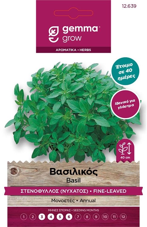 Ιδανικό για γλάστρα. Έτοιμο σε 40 ημέρες. Μονοετές. Ποικιλία με φύλλα λεπτά, λεία, χρώματος πράσινου φωτεινού, έντονα αρωματικά. Με τακτική κορυφολόγηση μεγαλώνουμε τον όγκο του φυτού. Σε ελαφριά στραγγιζόμενα εδάφη συστήνεται καλό πότισμα. Απόσταση φυτών (εκ.): 30. Απόσταση γραμμών (εκ.): 30. Βάθος σποράς (εκ.):0,1. Ημέρες φυτρώματος: 10-12. Έναρξη συγκομιδής (ημέρες): 40. Ocimum basilicum. 0261
